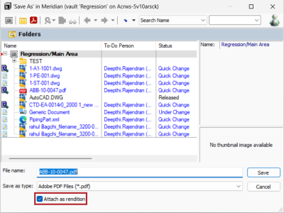 When saving a document in a Meridian vault using Application Integration in remote or online mode, you can now attach a rendition from the Save as dialog, instead of replacing the native document content. To do this, first save the rendition to your local workspace (LWS). In the Save as dialog, select Attach as rendition.
