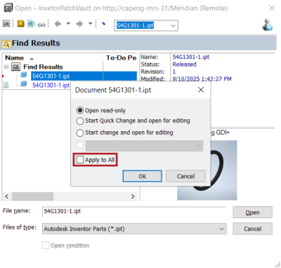When you open an assembly from Meridian PowerWeb, Inventor now automatically searches the vault to find and resolve missing component files. Find more information about this feature |