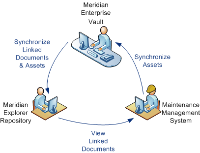 Meridian Enterprise provides a link between asset information stored in a maintenance management system and document information stored in a Meridian Explorer repository as illustrated in the following figure.